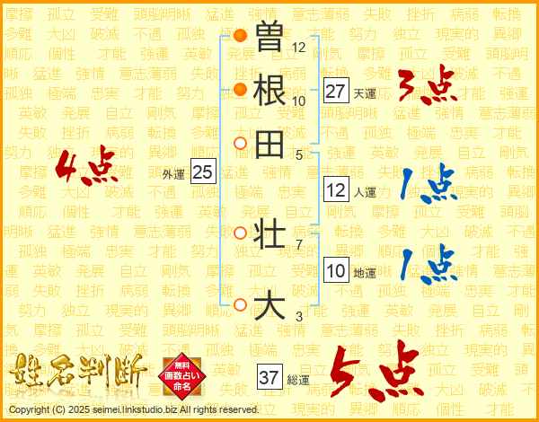 曽(12画)根(10画)田(5画) 壮(7画)大(3画)