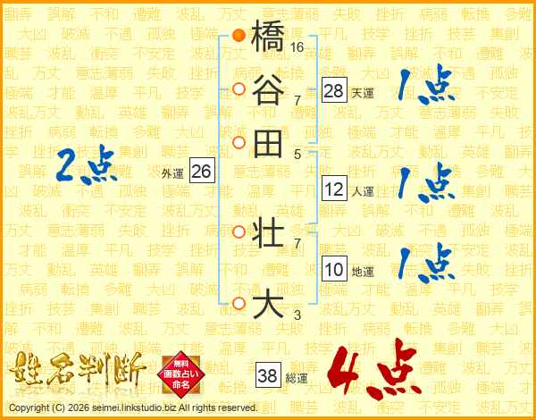 橋谷田壮大さんの総運は38画の4点!