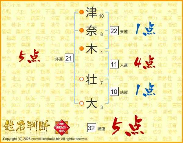 津(10画)奈(8画)木(4画) 壮(7画)大(3画)