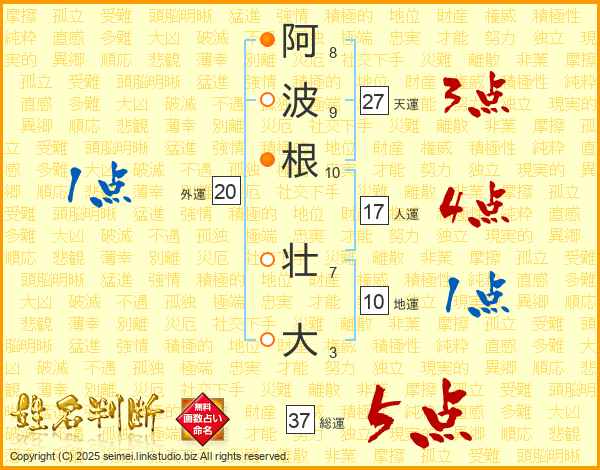 阿(8画)波(9画)根(10画) 壮(7画)大(3画)