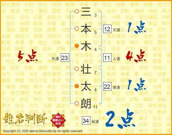 三(3画)本(5画)木(4画) 壮(7画)太(4画)朗(11画)