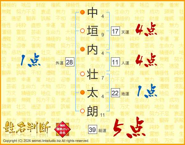 中(4画)垣(9画)内(4画) 壮(7画)太(4画)朗(11画)