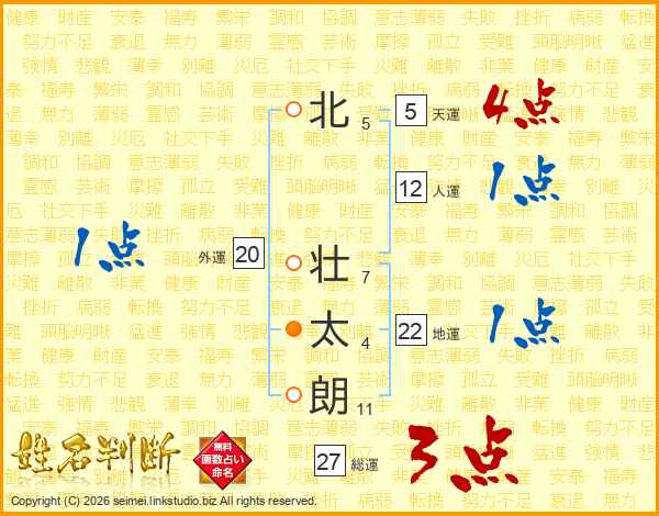 北(5画) 壮(7画)太(4画)朗(11画)