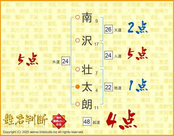 南(9画)沢(17画) 壮(7画)太(4画)朗(11画)