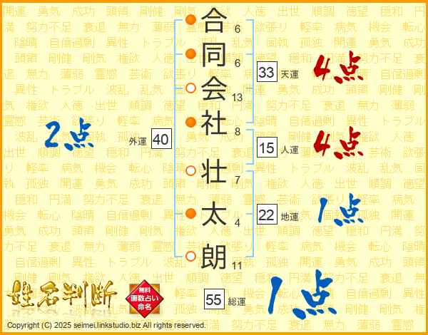 合(6画)同(6画)会(13画)社(8画) 壮(7画)太(4画)朗(11画)