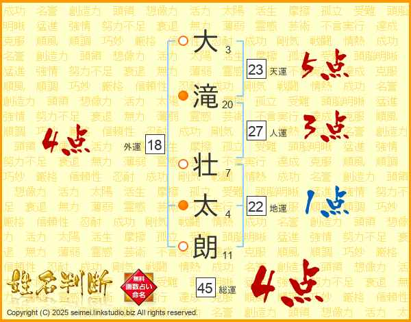 大(3画)滝(20画) 壮(7画)太(4画)朗(11画)