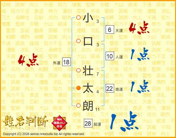 小(3画)口(3画) 壮(7画)太(4画)朗(11画)