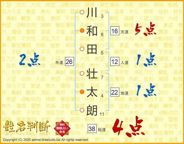 川(3画)和(8画)田(5画) 壮(7画)太(4画)朗(11画)