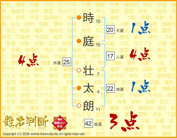 時(10画)庭(10画) 壮(7画)太(4画)朗(11画)