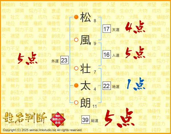 松(8画)風(9画) 壮(7画)太(4画)朗(11画)