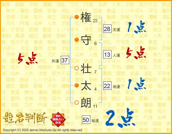 権(22画)守(6画) 壮(7画)太(4画)朗(11画)