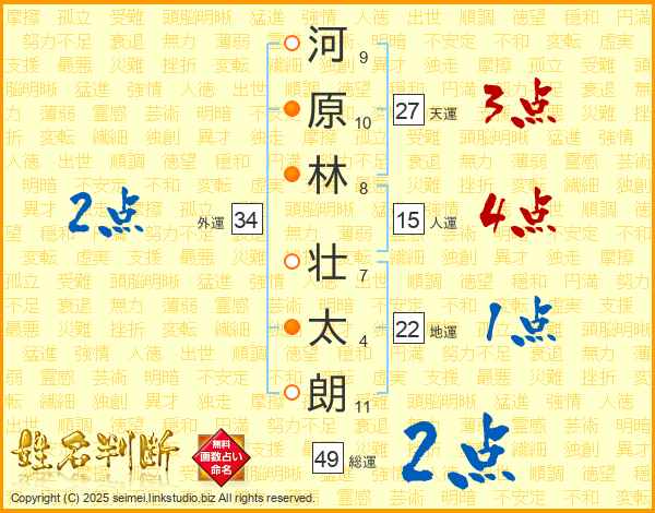 河(9画)原(10画)林(8画) 壮(7画)太(4画)朗(11画)