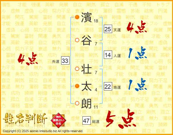 濱(18画)谷(7画) 壮(7画)太(4画)朗(11画)
