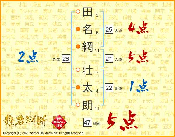 田(5画)名(6画)網(14画) 壮(7画)太(4画)朗(11画)