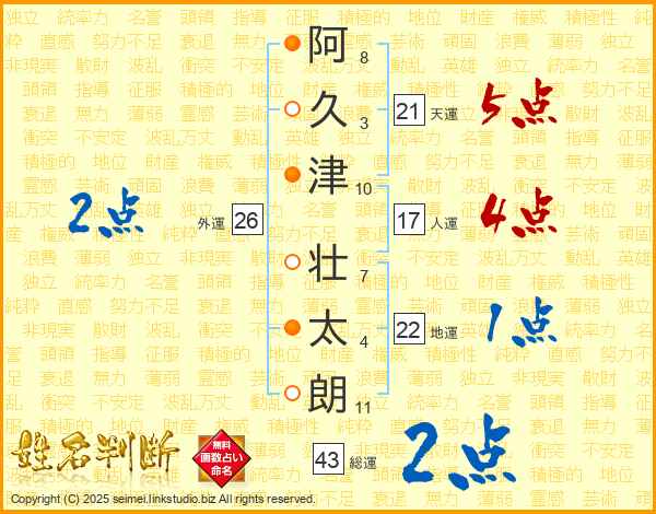 阿(8画)久(3画)津(10画) 壮(7画)太(4画)朗(11画)