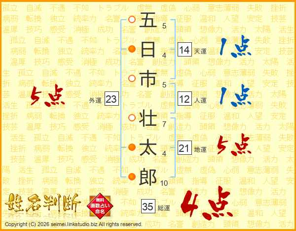五(5画)日(4画)市(5画) 壮(7画)太(4画)郎(10画)