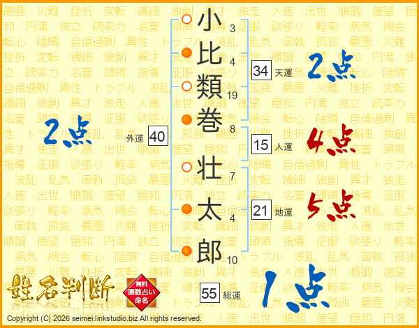 小(3画)比(4画)類(19画)巻(8画) 壮(7画)太(4画)郎(10画)