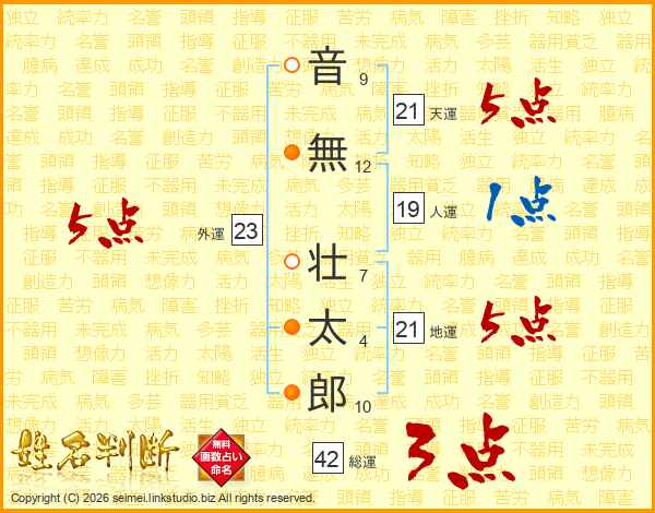 音(9画)無(12画) 壮(7画)太(4画)郎(10画)