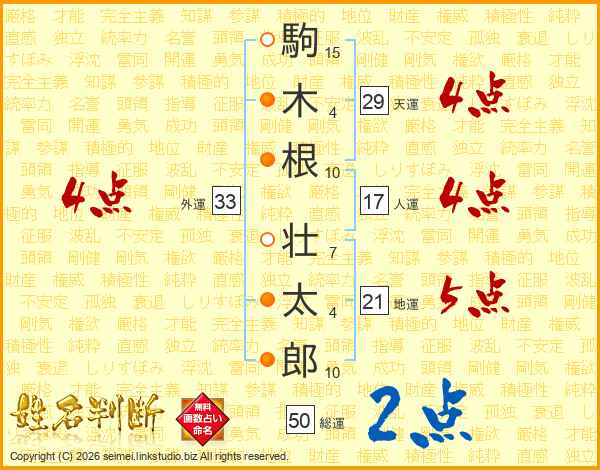 駒(15画)木(4画)根(10画) 壮(7画)太(4画)郎(10画)
