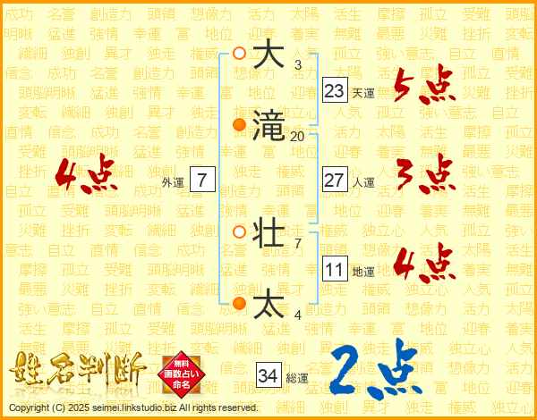 あなたの人生を表す1番重要な運勢です。生涯を通じて影響する総合運となり、主に50歳以降の晩年期に影響を及ぼします。苗字と名前の合計画数。