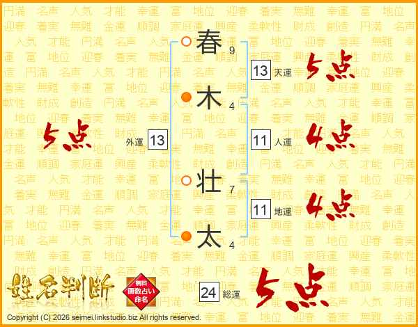 春(9画)木(4画) 壮(7画)太(4画)