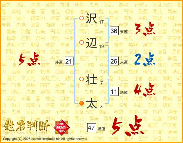 沢(17画)辺(19画) 壮(7画)太(4画)