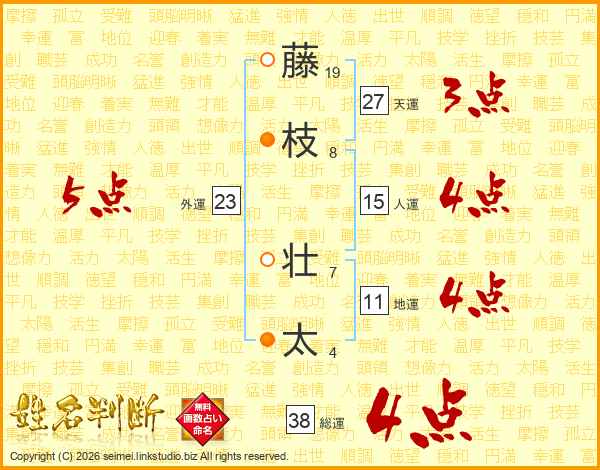 藤(19画)枝(8画) 壮(7画)太(4画)