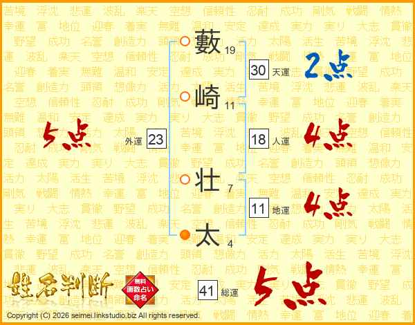 藪(19画)崎(11画) 壮(7画)太(4画)