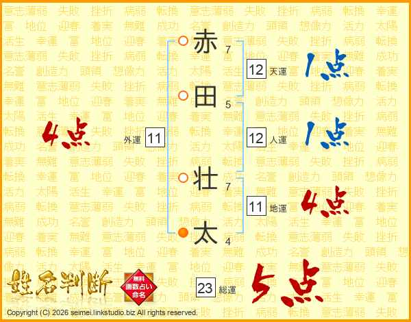 生活面を象徴する運勢です。外部から受ける影響力を表し、結婚運、家庭運や職場、環境への順応性を表します。総運から人運を引いた画数。姓や名が1文字の場合を除く。