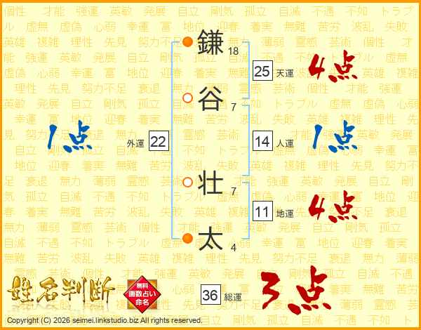 鎌(18画)谷(7画) 壮(7画)太(4画)