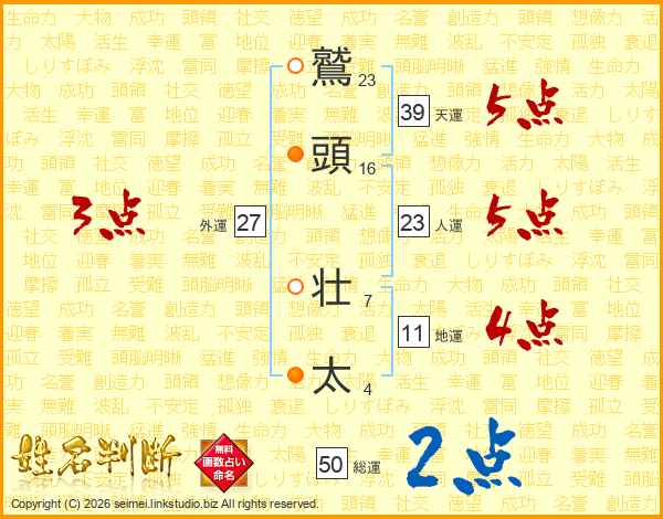 鷲(23画)頭(16画) 壮(7画)太(4画)