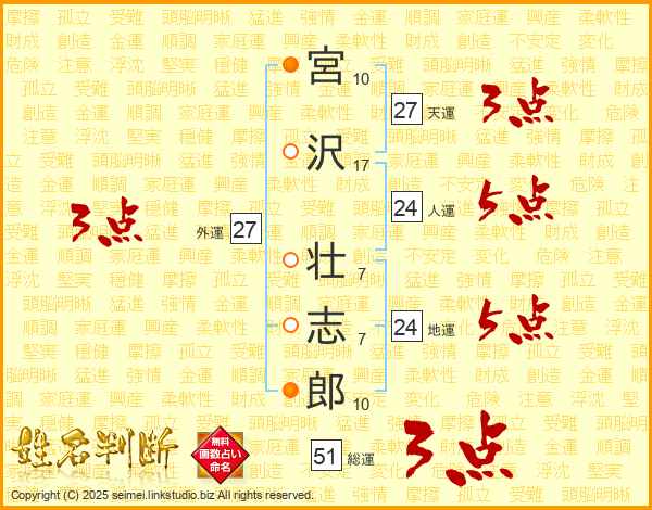 宮(10画)沢(17画) 壮(7画)志(7画)郎(10画)