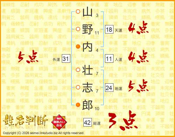 山(3画)野(11画)内(4画) 壮(7画)志(7画)郎(10画)