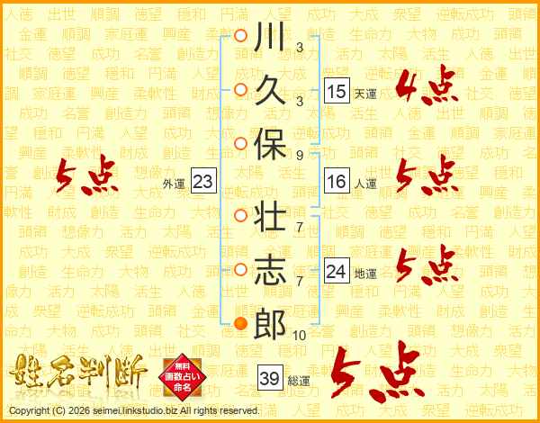 川(3画)久(3画)保(9画) 壮(7画)志(7画)郎(10画)
