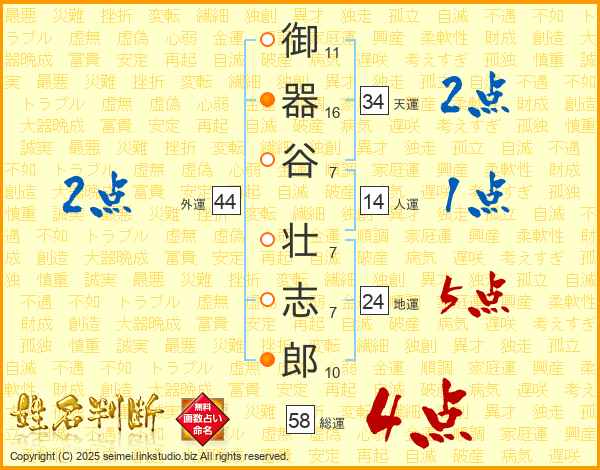 御(11画)器(16画)谷(7画) 壮(7画)志(7画)郎(10画)