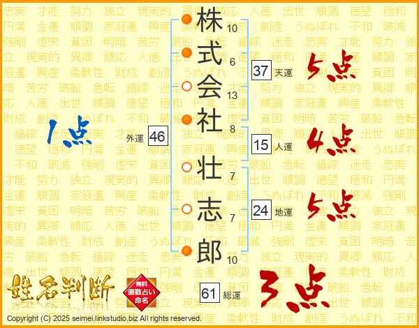 株(10画)式(6画)会(13画)社(8画) 壮(7画)志(7画)郎(10画)