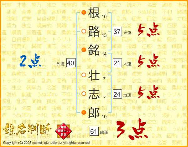 根(10画)路(13画)銘(14画) 壮(7画)志(7画)郎(10画)