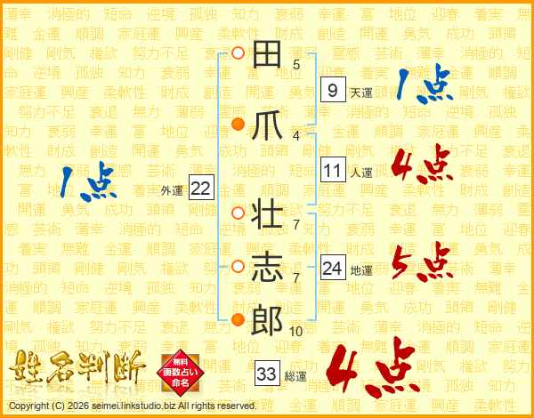 田(5画)爪(4画) 壮(7画)志(7画)郎(10画)