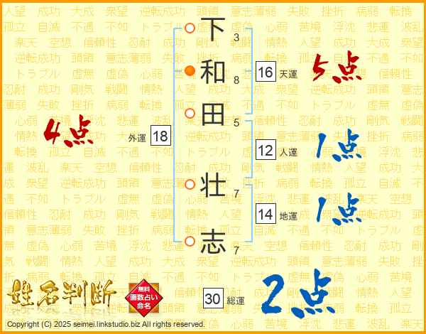 生活面を象徴する運勢です。外部から受ける影響力を表し、結婚運、家庭運や職場、環境への順応性を表します。総運から人運を引いた画数。姓や名が1文字の場合を除く。