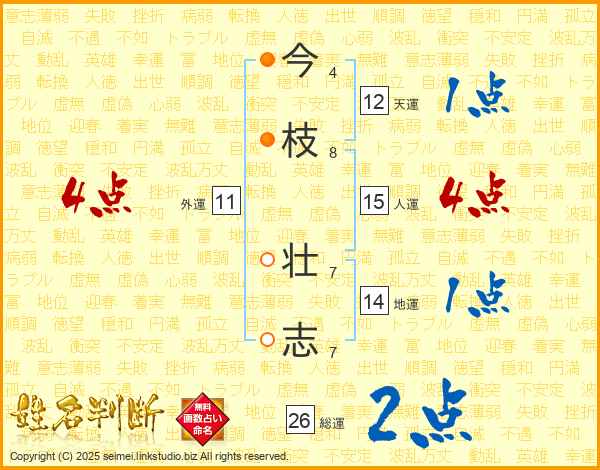 生活面を象徴する運勢です。外部から受ける影響力を表し、結婚運、家庭運や職場、環境への順応性を表します。総運から人運を引いた画数。姓や名が1文字の場合を除く。
