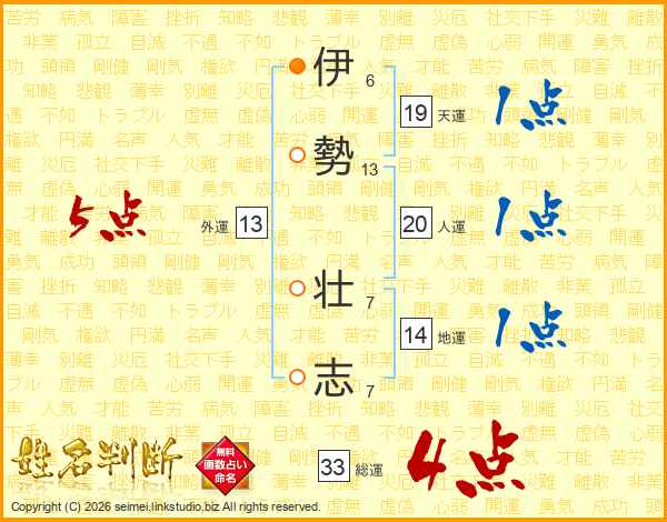 伊(6画)勢(13画) 壮(7画)志(7画)