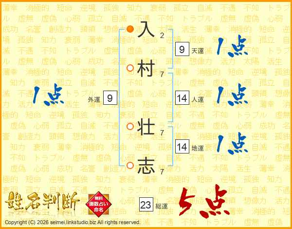 入(2画)村(7画) 壮(7画)志(7画)