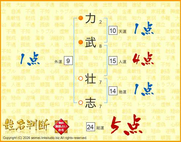 生活面を象徴する運勢です。外部から受ける影響力を表し、結婚運、家庭運や職場、環境への順応性を表します。総運から人運を引いた画数。姓や名が1文字の場合を除く。