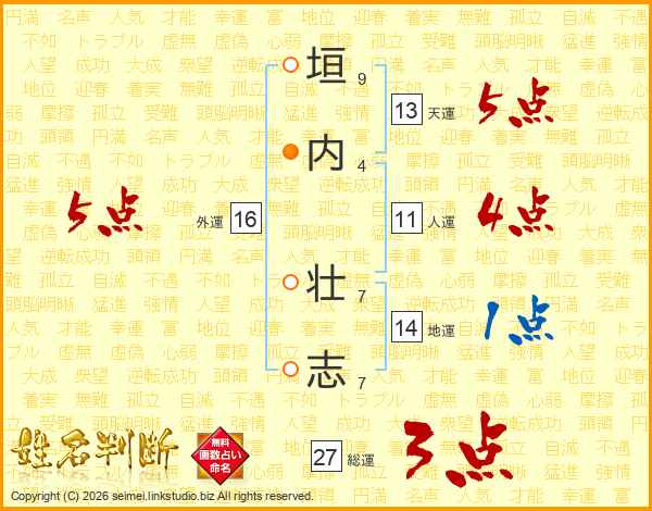 垣(9画)内(4画) 壮(7画)志(7画)