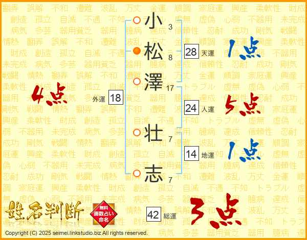 小(3画)松(8画)澤(17画) 壮(7画)志(7画)