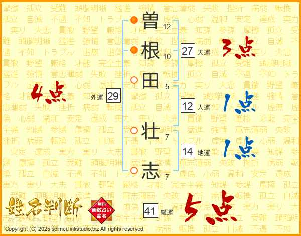 曽(12画)根(10画)田(5画) 壮(7画)志(7画)