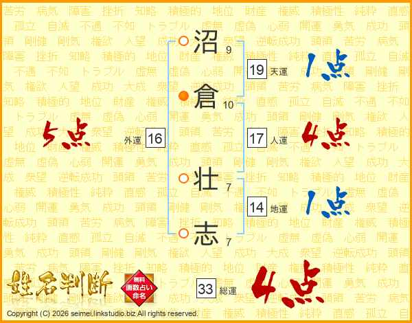 沼(9画)倉(10画) 壮(7画)志(7画)