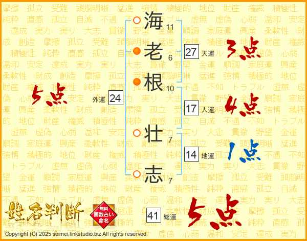 海(11画)老(6画)根(10画) 壮(7画)志(7画)