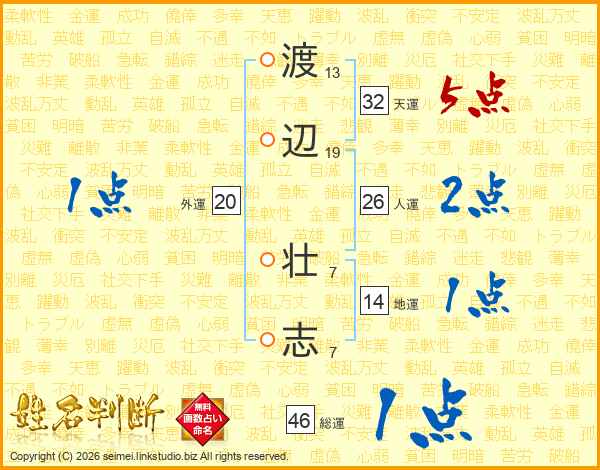 渡(13画)辺(19画) 壮(7画)志(7画)
