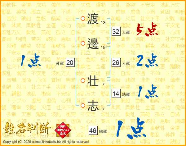 渡(13画)邊(19画) 壮(7画)志(7画)